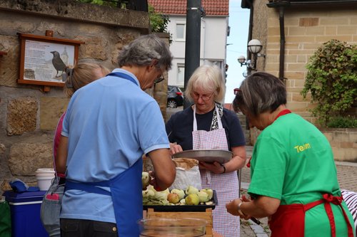 Nachdem sich am Nachmittag die Sonne von ihrer besten Seite zeigte, starteten unsere letzten Vorbereitungen. Vor dem Backhaus wurden fleißig Äpfel zu unserem selbst gemachten Apfelkuchen nach Omas Rezept verarbeitet und zwei Dutzend Bleche Flammkuchen in klassischer und vegetarischer Variante zubereitet. Des Weiteren wurden Sitzgelegenheiten als auch der Getränkeverkauf aufgebaut. Für all die geleistete Arbeit möchten wir uns recht herzlich bei allen Helfenden bedanken. Denn ohne die ehrenamtliche Hilfe könnten wir solch eine Veranstaltung nicht stemmen. Nachdem die weit über 100 Zuschauenden den Hunger besiegt und den Durst gestillt hatten, begann um 20.30 Uhr, während der Dämmerung, der Film. In diesem Jahr zeigten wir die Komödie „Zwei zu Eins“.